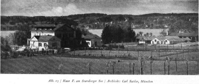 „Klassizistisch ist auch das Haus F. am Starnberger See empfunden und streng durchgeführt. Von der Landstraße aus führt ein Zufahrtsweg zu dem von zwei Flügelbauten umrahmten Ehrenhof, auf den sich die von zwei glattschäftigen dorisierenden Säulen begleitete und von einem Balkon überdachte Eingangstür öffnet. Diese Ausbildung der Eingangstüre erscheint in ihren wohlabgewogenen Verhältnissen und dem reizvollen Gegensatz zwischen dem leichten Gitterwerk der Brüstung und dem bei aller Schlankheit doch schweren Architravbau besonders glücklich gelöst, ergibt für die Auffahrt einen willkommenen Blickpunkt und verleiht dem im übrigen schmucklos gebliebenen Äußeren des Hauses einen wertvollen Schmuck. Von den Innenräumen dieses Landsitzes vermittelt der hier wiedergegebene Musiksaal einen Eindruck Sattlerscher Raumgestaltung, die vielfach gerühmt wird und wofür das Musikzimmer eines Sanatoriums in Loschwitz bei Dresden ein weiteres Beispiel bietet. Während der Musiksaal klassizistisches Gepräge hat und die Überlieferung Münchens aus den Zeiten Ludwigs I. weiterführt, klingt der Saal leise an das Dresdner Barock an. Bei dem Hause F. ist wie bei Elmau die Einfügung des Baues in die Landschaft besonders feinfühlig gelöst. Die Lage des Hauses inmitten des großen an den See stoßenden Grundstücks erlaubt auch eine glückliche Entwicklung des Gartens, eines wohltuenden Ineinandergreifens von Haus und Landschaft.„