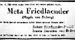 Am 15. November 1909 heirateten der Kaufmann Robert Rudolf Josef Maria Friedlaender und Meta Cleophea von Dulong vor dem Standesbeamten in Berlin-Schöneberg. Die zahlreichen Zuschreibungen von Friedlaender-Prechtl an seine „Alkestis“ können ihre bemerkenswerte und lebenslange Bedeutung belegen.