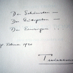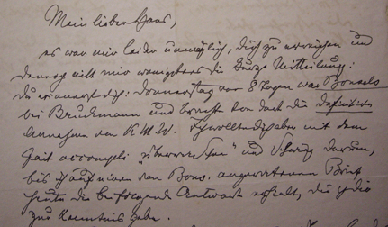 Mir selbst hat die Kriegsdiät recht gut getan; habe trotz fünfzig Pfund minus noch immer zuzusetzen. Lebe seit Krieg natürlich ohne Schoff-Sekret-Kammerdien-ör; bin wie Hieronymus in mein Gehäus interniert; aber da das Gehäus erhalten geblieben ist besteht kein Anlass zu murren.“